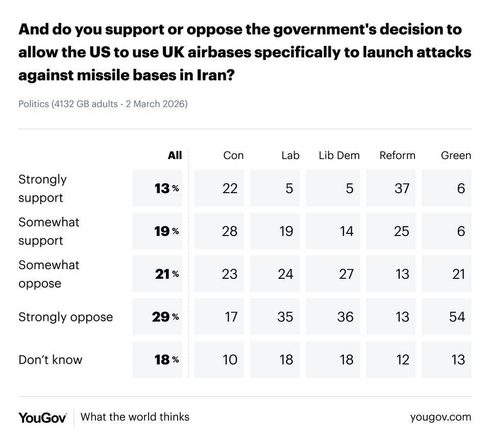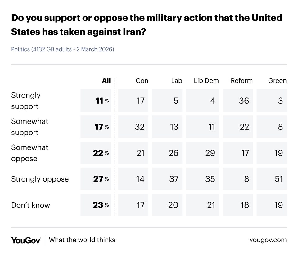 | | | Monday, 2 March | | | By 49% to 28%, Britons oppose US strikes on Iran | | | | With the US, alongside Israel, launching its much-anticipated attack on Iran over the weekend, today’s survey shows that Britons are opposed to the attacks by 49% to 28% | | | | Attitudes differ significantly by party, however: the majority of Reform UK voters (58%) back the strikes, as do a plurality of Tories (49%) | | | | By contrast, 63-64% of Labour and Lib Dem voters are opposed, as are 70% of Greens | | | | Across the pond, our colleagues at US found the American public opposed to the conflict by 45% to 36% | | | | | | | | | | Keir Starmer this morning announced that he had reversed his previous opposition to the US using RAF bases to launch attacks on Iran, so long as the targets were restricted to missile sites | | | | He does so in the face of public opposition – our survey in late February found 58% opposed to allowing the US to launch strikes from RAF bases, and today’s poll finds that figure still stands at 50% when the ‘missile sites only’ caveat is included | | | | Again, Reform and Conservative voters are more in favour, while Labour, Lib Dem and Green voters are generally opposed | | | | | | | | | | There have been calls for the government to praise or condemn the strikes, but they have settled for a middle ground where they avoid doing either | | | | This approach is likewise favoured by the public, 45% of whom say the government should neither praise nor condemn the US for the Iran attacks – this is the most preferred option among Tories (60%) and to a lesser extent Labour and Lib Dem voters (44-47%) | | | | 21% want the UK to condemn the US for its actions (particularly the Greens, at 44%), while 12% want to praise America (Reform UK voters are most in favour, at 39% - joint with the number who think we should do neither) | | | | | | | | | | | | | | | | | | | | |