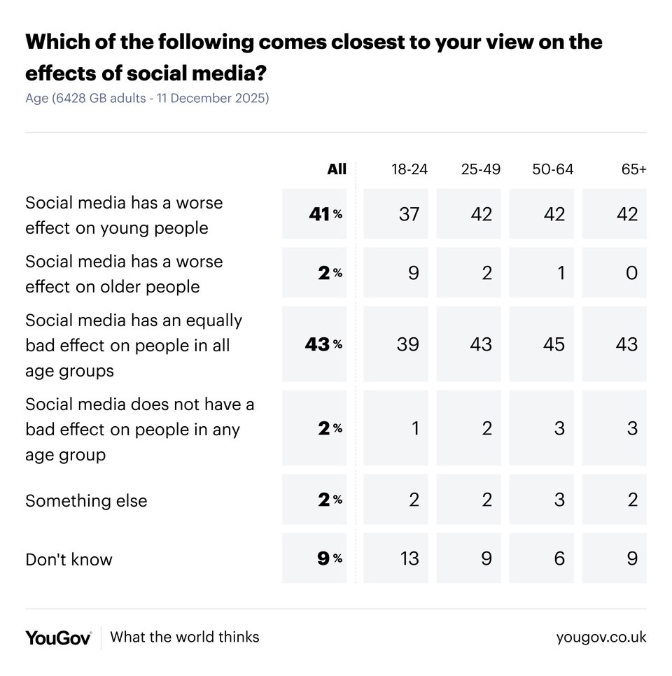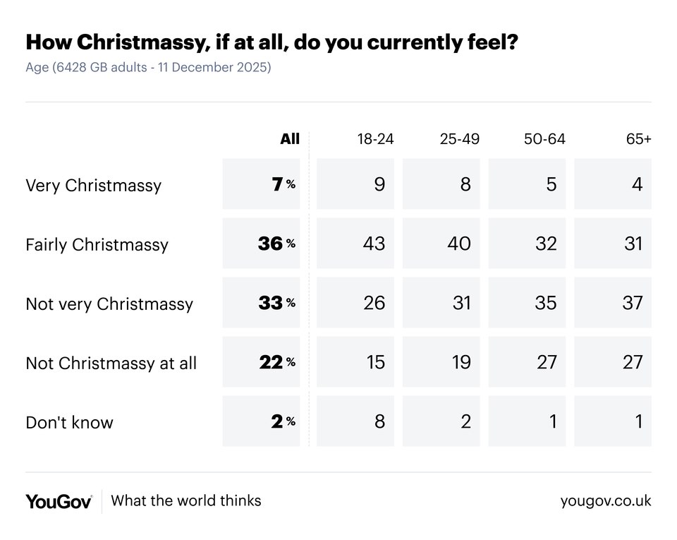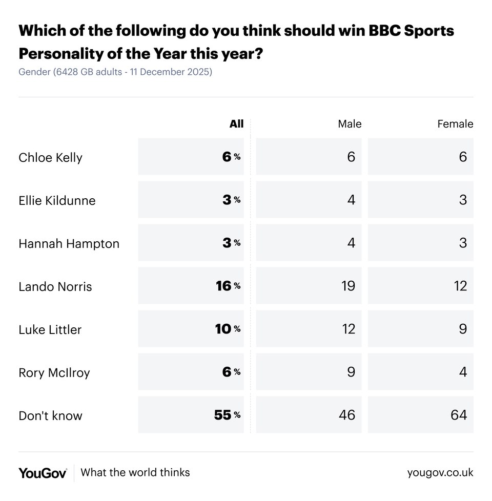 | | | Thursday, 11 December | | | Who do Britons think should win Sports Personality of the Year? | | | | The BBC have announced their six-person shortlist for this year’s Sports Personality of the Year award, featuring Lionesses Hannah Hampton and Chloe Kelly, women’s rugby world cup winner Ellie Kildunne, darts world champion Luke Littler, golfer Rory McIlory and Formula 1 champion Lando Norris. But who do the public think should win? | | | | 16% of Britons say Norris should lift this year’s trophy, while 10% opt for Littler. McIlroy and Kelly are the choices of 6%, with Hampton and Kildunne each being the pick of 3% of the public. | | | | Among those who backed a contender, there is only a small gender difference in choices between men and women, with 74% of men with a favourite backing one of the three men, relative to 69% of women. | | | | | | | | | | Australia’s social media ban for under 16s has come into force this week, reigniting debate about the impact of social media, with some saying that it’s unfair to portray it as having a uniquely bad effect on younger people. | | | | Indeed, Britons are divided, with 43% believing social media has an equally bad effect on people from all age groups and 41% thinking it has a worse effect on young people. | | | | Perhaps surprisingly, there is not a huge age difference on this question, with 39-45% of all age groups believing social media has an equally bad effect on people in all age groups, and 37-42% of all age groups believing younger people are impacted worse by social media. | | | | | | | | | | Christmas is growing ever nearer, with there now just two weeks until Christmas Day itself, but are Britons yet to get into the festive spirit? | | | | Still, not really, with just 43% of Britons saying they now feel at least fairly Christmassy, virtually unchanged from the proportion who said so last Friday and up just seven points since the 1 December. | | | | This compares to most Britons (55%) saying they are yet to feel particularly Christmassy, including 22% who say they currently don’t feel Christmassy at all. | | | | | | | | | | | | | | | | | | | | |