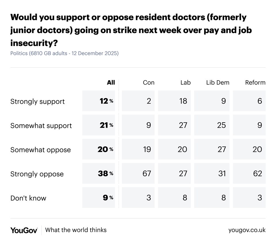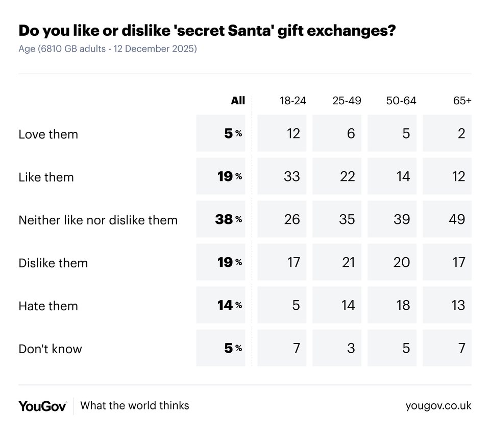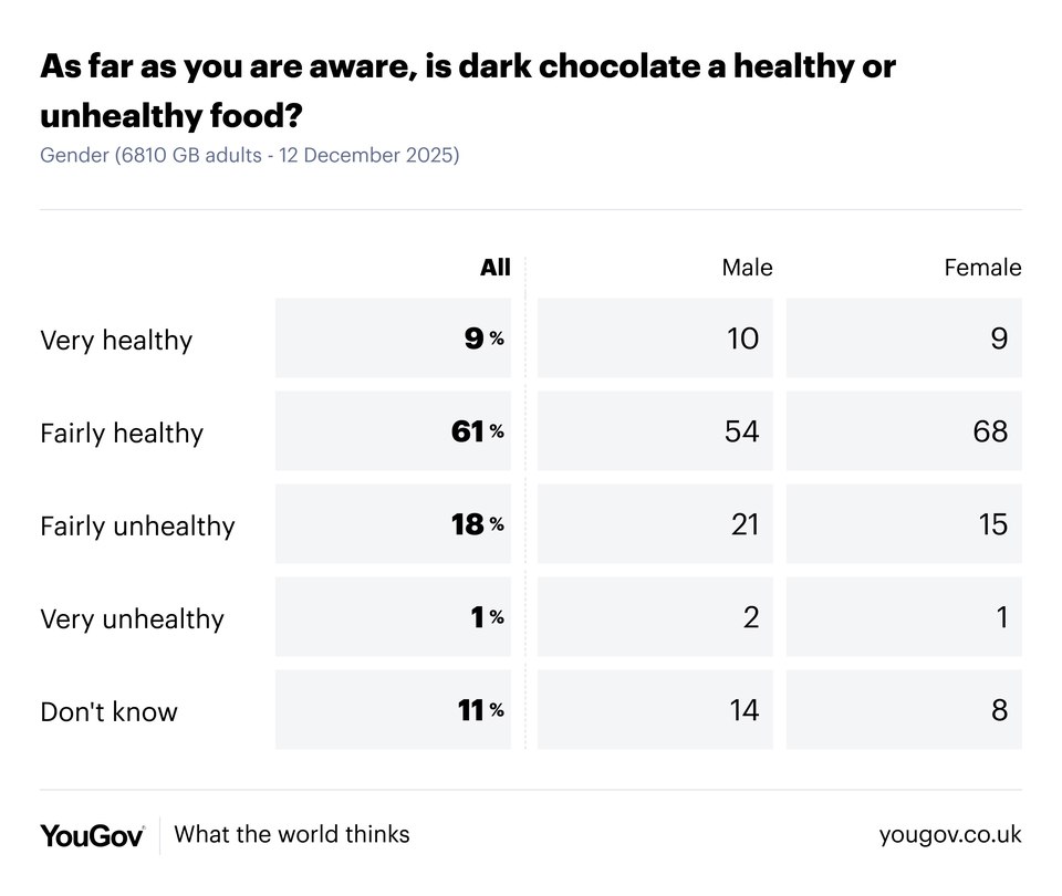 | | | Friday, 12 December | | | 58% of Britons oppose next week’s doctor strikes | | | | With next week’s strike by resident doctors looming, health secretary Wes Streeting has said he’s “extremely worried” about the NHS being a “double whammy” of rising flu patients and strike action, saying the current winter flu was “probably the worst pressure the NHS has faced since Covid”. | | | | 58% of Britons say they oppose resident doctors going on strike next week, relative to 53% opposing strikes at the beginning of last week. A third of Britons (33%) support the planned strike action. | | | | Labour voters remain the most sympathetic to the strikes, though are split 45% to 47% over whether the action should take place next week. This compares to 58% of Lib Dems, 82% of Reform UK voters and 86% of Conservatives being opposed to the imminent strikes. | | | | | | | | | | A new study has linked a particular chemical found in dark chocolate – theobromine – to a slowed rate of biological ageing, adding to previous studies that have linked the bitter-sweet food to health benefits from improved blood flow to sharper cognition. | | | | The stream of positive stories about dark chocolate has captured the public imagination, with 61% of Britons seeing it as a fairly healthy food, alongside a further 9% who say that, as far as they are aware, dark chocolate is a very healthy food. | | | | Women are more likely to believe in the health benefits of dark chocolate, with 77% seeing it as an at least fairly healthy food, relative to 64% of men. | | | | | | | | | | Secret Santa gift exchanges have become a staple of Christmas for many in recent years, often in workplaces or friendship groups. But does this form of festive gift giving, which often comes with specific rules and can be for people you’re not enormously close to, spread the festive cheer? | | | | Perhaps not. Just 24% of Britons say they outright like or even love secret Santa exchanges, though a further 38% don’t feel strongly either way. A third of Britons (33%) outright dislike the activity. | | | | Younger Britons are more positive towards secret Santa, with nearly half of 18-24 year olds (45%) liking or loving the modern tradition, compared to 28% of 25-49 year olds, 19% of 50-64 year olds and just 14% of over 65s. | | | | | | | | | | | | | | | | | | | | |