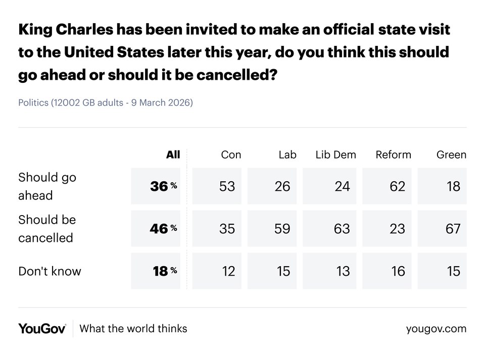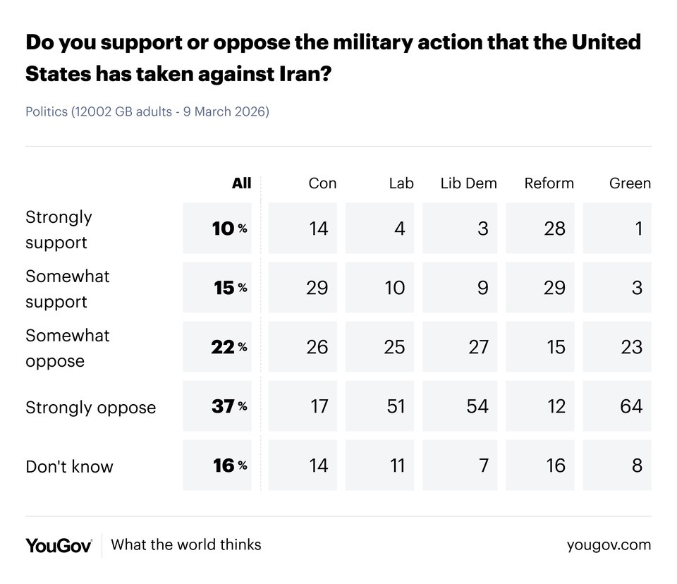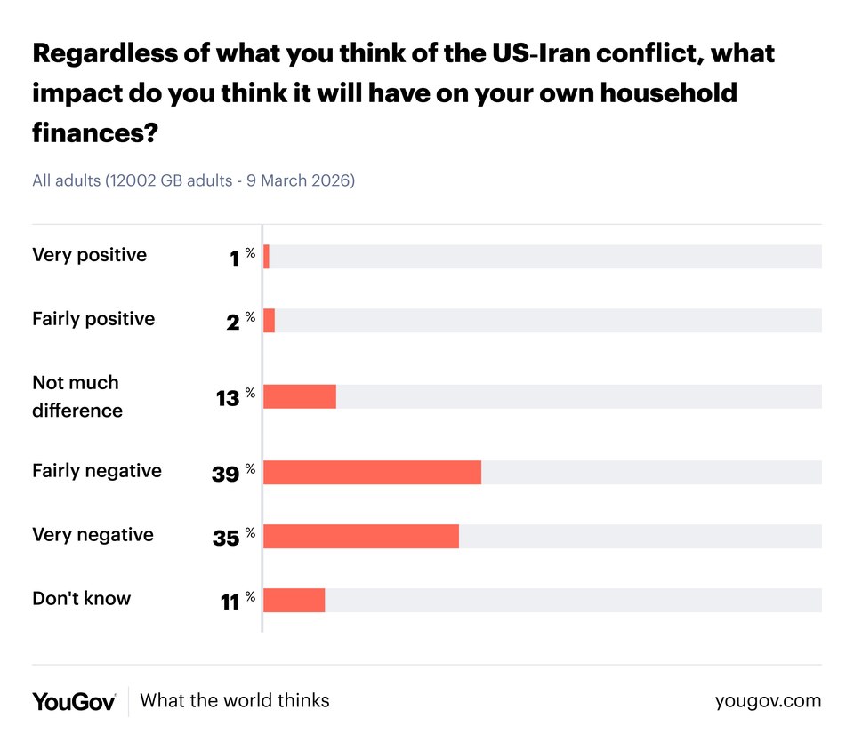 | | | Monday, 9 March | | | 74% of Britons expect Iran conflict to negatively impact finances | | | | With the price of oil passing $100 a barrel after the largest one-day spike in six years and the UK’s biggest mortgage lenders raising their rates, the US-Israeli war with Iran is set to have a big impact on Britons’ household finances, with Rachel Reeves warning it is likely to increase inflation. | | | | Indeed, 74% of the public already expect the conflict to have a negative impact on their household’s finances – including 35% who expect it to have a ‘very’ negative impact – relative to only 13% who expect it will make little difference. | | | | | | | | | | While Kemi Badenoch has been amongst those calling on the UK to do more to support the US’s efforts in Iran, opposition to the war among the British public has grown significantly in the last week. | | | | 59% of Britons now say they are opposed to the military action that the US has taken against Iran, up ten points since last Monday, though the proportion in favour has remained more steady at 25%, down three points. | | | | Opposition has risen by 17pts among Lib Dem and Green voters, 13pts with Labour voters and 8pts among Conservatives, but is largely unchanged among Reform UK voters. | | | | This leaves Conservatives split 43% to 43% on the US’s actions, while 57% of Reform UK voters support them and 76-87% of Labour, Lib Dem and Green voters oppose them. | | | | | | | | | | Due to the conflict with Iran, Ed Davey has called on the government to call off King Charles’ planned state visit to the US, saying it would be “yet another huge diplomatic coup for President Trump” which “should not be given to someone who repeatedly insults and damages our country”. | | | | The British public tend to agree with the Lib Dem leader, with 46% believing the visit should be cancelled, relative to 36% who believe it should go ahead. | | | | While 67% of Green voters, 63% of Lib Dems and 59% of Labour voters believe the trip should be pulled, 53% of Conservatives and 62% of Reform UK voters want it to go ahead. | | | | | | | | | | | | | | | | | | | | |